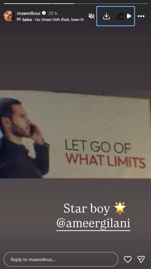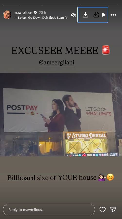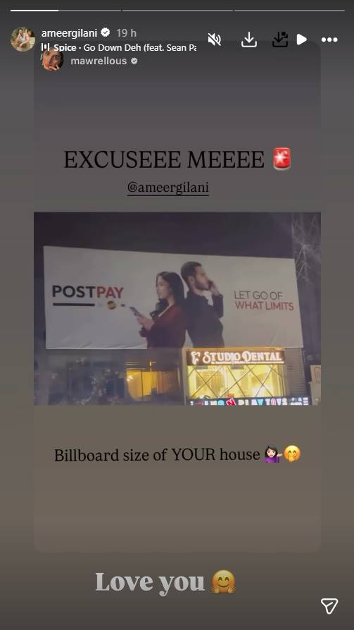 The billboard captured Ameer in a composed side pose, holding a phone to his ear, with a buzzcut adding to his sharp look. Amused and proud, Mawra zoomed in on the advertisement, captioning the first story: “EXCUSEEE MEEEE @ameergilani Billboard size of YOUR house.” In a follow-up story, she simply wrote, “Star Boy,” highlighting her playful admiration.