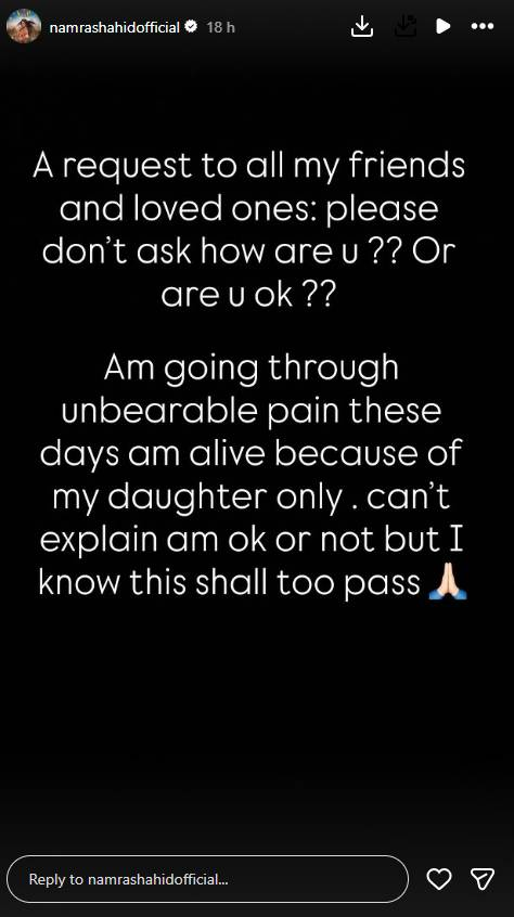 Pakistani actress Namra Shahid has opened up about her grief on Instagram, describing her current state as “unbearable pain.” In a recent story, she requested friends and well-wishers not to ask, “How are you?” or “Are you okay?” while expressing her effort to stay strong for the sake of her daughter.