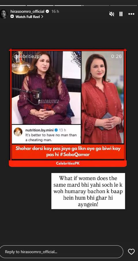 The discussion gained further traction after actress Hira Soomro publicly questioned whether society would accept the same logic if applied to women. Meanwhile, Hira Khan also joined the conversation indirectly, sharing a post that many interpreted as a subtle response to the ongoing debate.